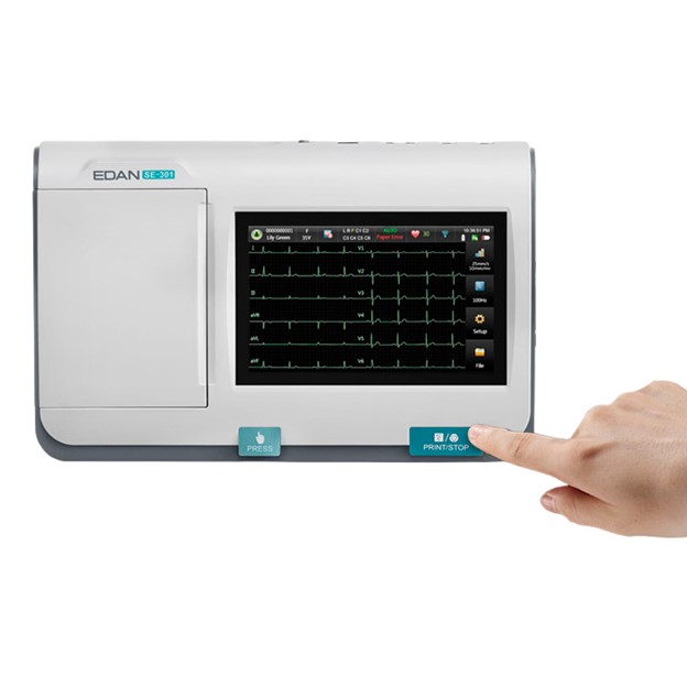 SE-301 3-канальный аппарат ЭКГ обладающий малым весом и компактными размерами, позволяющий одновременно записывать в память, отображать на встроенном дисплее и распечатывать на бумаге 12 стандартных отведений, управление с сенсорного экрана.